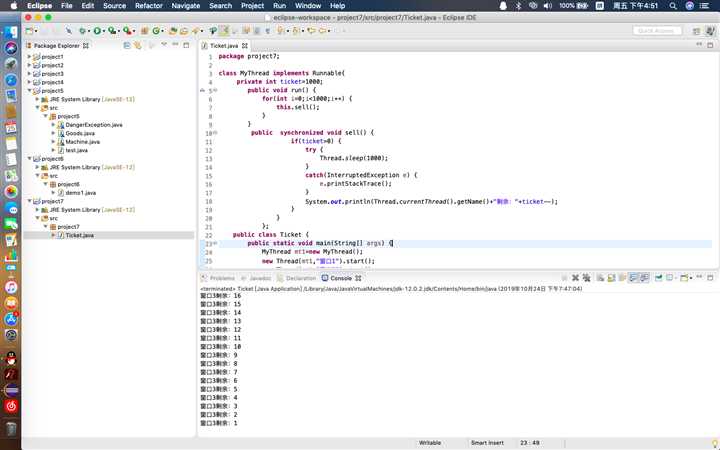 System.out.println(Thread.currentThread().getName()+"剩余:"+ticket--);