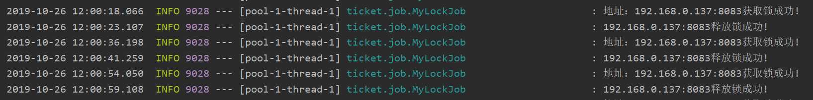 本地起了四台服务8080~8083,模拟多台服务器争抢锁及释放锁的过程,这里展示一分钟内获取锁和释放锁的情况。