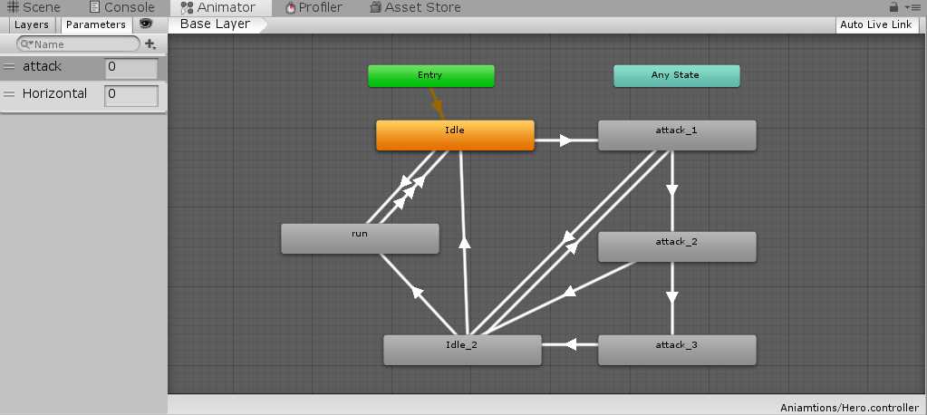 - 背景:存在idle、idle_2、attack_1、attack_2、attack_3动画片段实现三连击的攻击效果,根据attack值切换。我们仅关注几个attack的切换,其中