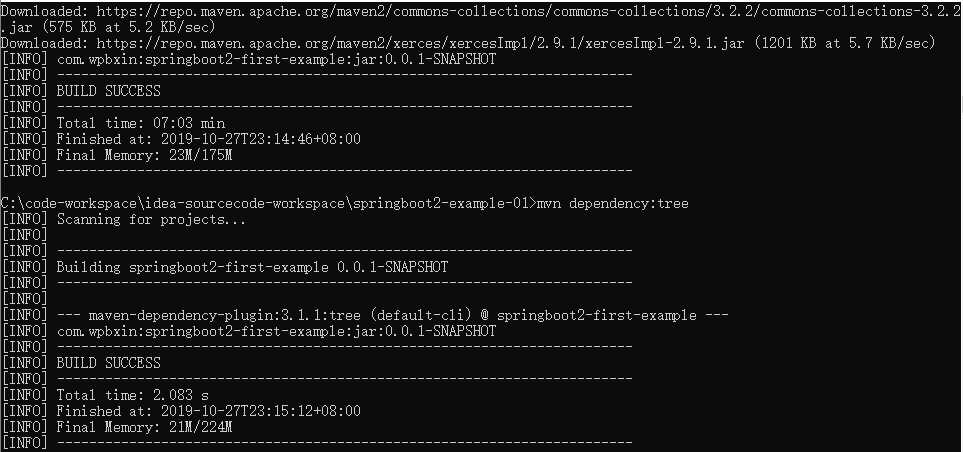 springboot 提供了很多的“Starters”来添加相关的 jar 包依赖,案例中的 spring-boot-starter-parent 是一个比较特殊的 parent pom ,它提供了很多有用的默认配置,但是没有任何的 jar 依赖。这里可以运行下 mvn dependency:tree 查看下当前工程的依赖(第一次运行估计会下载很多相关 jar 包,截图的下半部分第二次运行这个命令,上半部分的是第一次的),可以发现 spring-boot-starter-parent 并没有提供任何依赖。