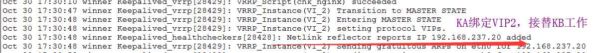 重启keepalivedA,keepalivedA恢复工作,重新绑定VIP1,keepalivedB移除VIP1,继续监听