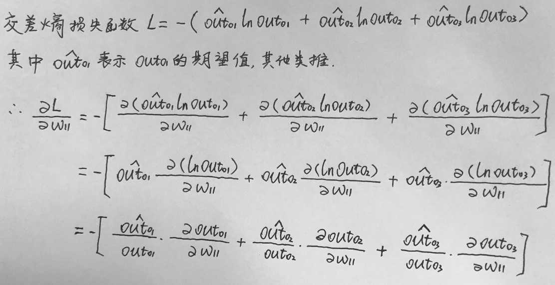 。其他可类似推出。损失函数用交叉熵。今天我们看看网络参数(以隐藏层和输出层之间的w11以及输入层和隐藏层之间的q11为例)在每次迭代训练后是怎么更新的。先看隐藏层和输出层之间的w11。