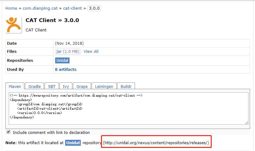 本人在测试过程中,发现maven依赖的方式下载不下来,固直接下载jar包下来安装到本地仓库:http://unidal.org/nexus/content/repositories/releases/com/dianping/cat/cat-client/3.0.0/cat-client-3.0.0.jar
