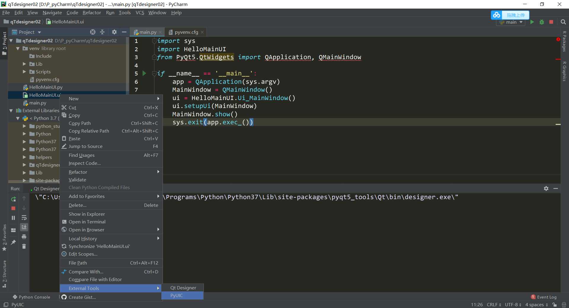 然后在 pycharm IDE 中的项目导航栏,找到 HelloMainUI.ui,右键 -- External tools -- PyUIC(将UI格式文件转化为 .py 格式文件)然后会生成一个 HelloMainUI.py 文件