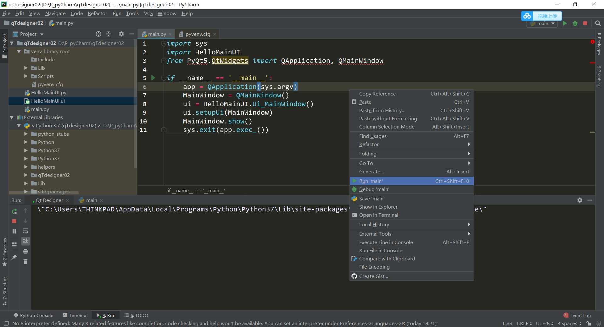 接着在 HelloMainUI.py 同级目录下创建一个 python 主程序,main.py,程序代码 参考给出的来源,这里借鉴一下