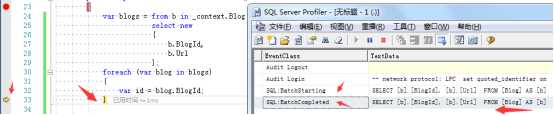 而当我们调试进去for循环时候,SQL Server Profiler监控里面可以看到出现了执行SQL语句。也就是说这时候查询结果blogs才执行发送给数据库返回结果集。