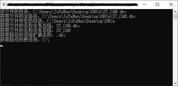 using System; using System.Collections.Generic; using System.IO; using System.Linq; using System.Text; namespace TBQDLKW { class Program { static void Main(string[] args) { //一个文件目录 string filePath = @"C:\Users\JuYaNan\Desktop\DBCs\ST_CAN.dbc"; Console.WriteLine("该文件的目录:" + filePath); string str = "获取文件的全路径:" + Path.GetFullPath(filePath); Console.WriteLine(str); str = "获取文件所在的目录:" + Path.GetDirectoryName(filePath); Console.WriteLine(str); str = "获取文件的名称含有后缀:" + Path.GetFileName(filePath); Console.WriteLine(str); str = "获取文件的名称没有后缀:" + Path.GetFileNameWithoutExtension(filePath); Console.WriteLine(str); str = "获取路径的后缀扩展名称:" + Path.GetExtension(filePath); Console.WriteLine(str); str = "获取路径的根目录:" + Path.GetPathRoot(filePath); Console.WriteLine(str); Console.ReadKey(); } } }