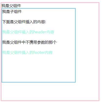 // 这是父组件 <div class="father"> <p>我是父组件</p> <!-- 引入子组件 --> <basepage> <template v-slot:header> <!-- 放入要插入在子组件中的内容 --> <p class="con">我是父组件插入的header内容</p> <br> </template> <template v-slot:footer> <!-- 放入要插入在子组件中的内容 --> <p class="con">我是父组件插入的footer内容</p> </template> <P>我是父组件中不携带参数的那个</P> <br> </basepage> </div> //这是子组件 <template> <div class="son"> <p>我是子组件</p> <br> <p>下面是父组件插入的内容:</p> <br> <template> <!-- v-slot中参数为header的将插入这里 --> <slot name="header"></slot> <!-- 父组件中不传递参数的将插入这里 --> <slot ></slot> <!-- v-slot中参数为footer的将插入这里 --> <slot name="footer"></slot> </template> </div> </template>