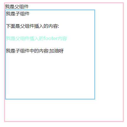 // 父组件哈 <div class="father"> <p>我是父组件</p> <!-- 引入子组件 --> <basepage> <template v-slot=‘news‘> <!-- 放入要插入在子组件中的内容 --> <p class="con">我是父组件插入的footer内容</p> <br> <p>我是子组件中的内容:{{news.info}}</p> </template> </basepage> </div> // 子组件 <template> <div class="son"> <p>我是子组件</p> <br> <p>下面是父组件插入的内容:</p> <br> <template> <slot :info=‘message‘></slot> </template> </div> </template> <script> export default { name:‘basepage‘, data() { return { message:"加油呀" } } }