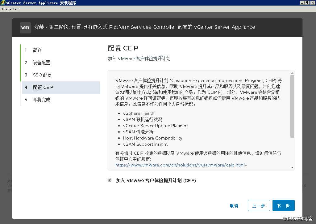 第2步,提示安装分为两个阶段,特别注意,从6.7 U3版本开始VMware逐渐取消PSC,到7.0版本全面取消。