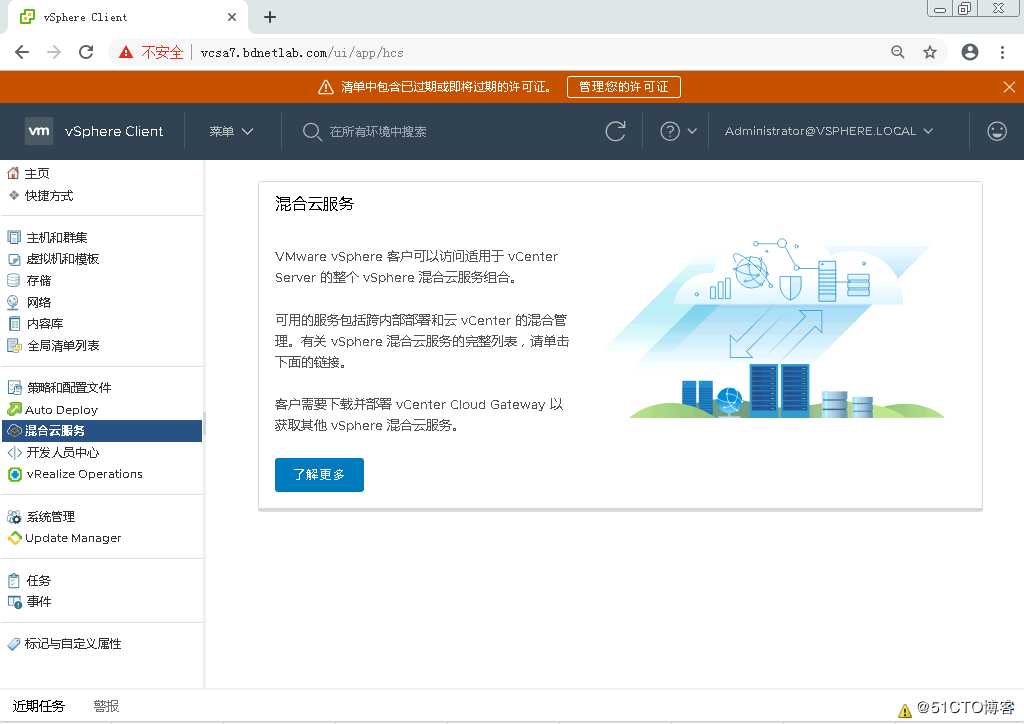 第24步,查看VCSA 7主页,左边增加了“混合云服务”和“开发人员中心”。