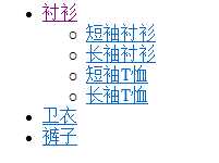 <!DOCTYPE html PUBLIC "-//W3C//DTD XHTML 1.0 Transitional//EN" "http://www.w3.org/TR/xhtml1/DTD/xhtml1-transitional.dtd"> <html xmlns="http://www.w3.org/1999/xhtml"> <head> <script src="jquery-1.7.1.min.js" type="text/javascript"></script> <title>jQuery Demo</title> </head> <script type="text/javascript"> //等待dom元素加载完毕. $(document).ready(function () { $(".level1 > a").click(function () { $(this).addClass("current") //给当前元素添加"current"样式 .next().show() //下一个元素显示 .parent().siblings().children("a").removeClass("current") //父元素的兄弟元素的子元素<a>移除"current"样式 .next().hide(); //它们的下一个元素隐藏 }); }); </script> <body> <!--<script type="text/javascript"> $(function () { alert("5555"); }) </script>--> <div class="box"> <ul class="menu"> <li class="level1"> <a href="#none">衬衫</a> <ul class="level2"> <li><a href="#none">短袖衬衫</a></li> <li><a href="#none">长袖衬衫</a></li> <li><a href="#none">短袖T恤</a></li> <li><a href="#none">长袖T恤</a></li> </ul> </li> <li class="level1"> <a href="#none">卫衣</a> <ul class="level2"> <li><a href="#none">开襟卫衣</a></li> <li><a href="#none">套头卫衣</a></li> <li><a href="#none">运动卫衣</a></li> <li><a href="#none">童装卫衣</a></li> </ul> </li> <li class="level1"> <a href="#none">裤子</a> <ul class="level2"> <li><a href="#none">短裤</a></li> <li><a href="#none">休闲裤</a></li> <li><a href="#none">牛仔裤</a></li> <li><a href="#none">免烫卡其裤</a></li> </ul> </li> </ul> </div> </body> </html>