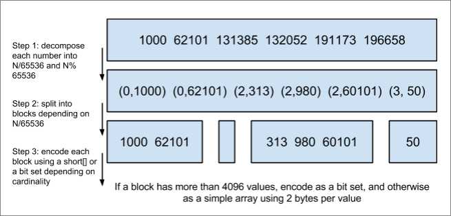 但这种bitmap数据结构有缺陷,看这组Posting List: [1, 3, 100000000] -> [1, 0, 1, 0, 0, 0, …, 0, 0, 1 ],最大数是1亿,就要1亿的比特表示,这么算下来,反而消耗了更多的内存。