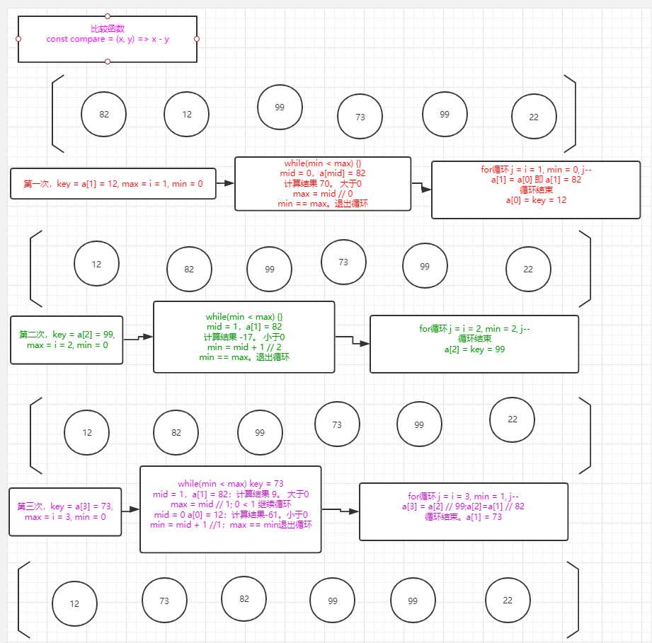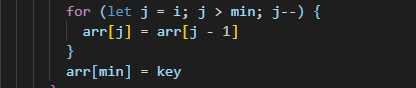 function insertSort(arr) { for(let i= 1; i < arr.length; i++) { let key = arr[i] // 哨兵,保存当前循环索引对应的值 let min = 0 // 插值位置 let max = i // 已循环次数 // 遍历已循环的数组,找寻插值位置 while(min < max) { // 中值 >>有符号右移 类似于 Math.floor(int/2) int是正整数 let mid = min + ((max - min) >>1) // 比较函数,传入索引中值对应的值和哨兵 const order = compare(a[mid], key) // 如果等于0 if (order === 0) { // 把mid赋值给min。作为插值位置,退出循环 min = max = mid break; } /** * 已循环的数组是有序的数组,索引中值对应的值与哨兵比较 * 小于则将mid赋值给min,继续取min与max值的中值。然后比较该中值对应的值与哨兵的大小 * 大于则将中值赋值给max值,在取min与新max的中值,然后比较该中值对应的值与哨兵的大小 * 循环往复,直到min = max,退出该循环,找到插入点 */ if (order < 0) { min = mid + 1 } else { max = mid } } /** * 插入操作循环,从已循环数组的末尾开始,依次把上一个索引值赋给当前索引值 * 如: a[3] = a[2] a[2] = a[1],一直到插值位置min。 * 循环结束后,把哨兵赋值给arr[min] * */ for (let j = i; j > min; j--) { arr[j] = arr[j - 1] } arr[min] = key } }