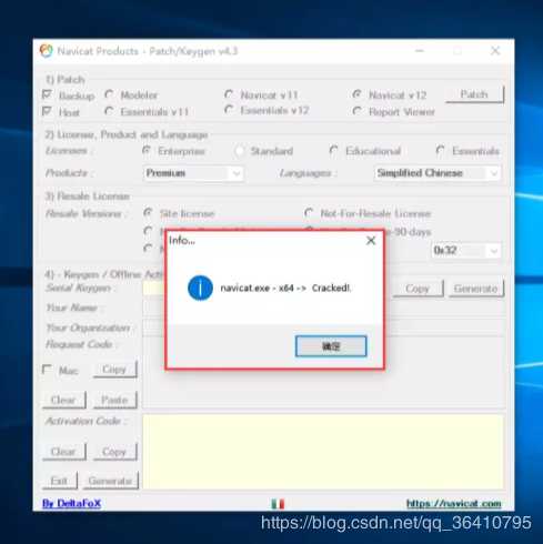 此时出现如下弹窗,提示 navicat.exe - x64 -> Cracked ,提示已破解(别高兴,还没结束)。若提示libcc.dll或 navicat.exe 出错,检查是否未关闭Navicat Premium,或到安装目录下将 libcc.dll 和 navicat.exe 删除,并将 libcc.dll.BAK 或 navicat.exe.BAK 去掉.BAK后缀名。否则卸载已安装的Navicat Premium并清理文件残留和注册表残留: