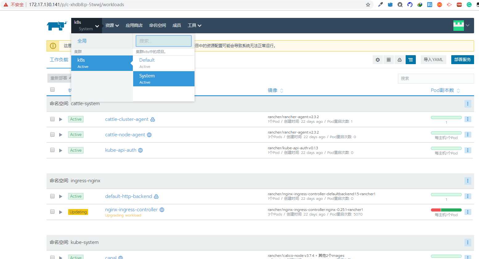 首先进入到集群中的System命令空间,因为kubenetes dashboard是给整个集群使用的,并不是默认的Default命名空间使用的