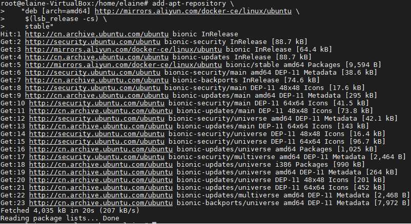 $ sudo add-apt-repository "deb [arch=amd64] http://mirrors.aliyun.com/docker-ce/linux/ubuntu $(lsb_release -cs) stable"