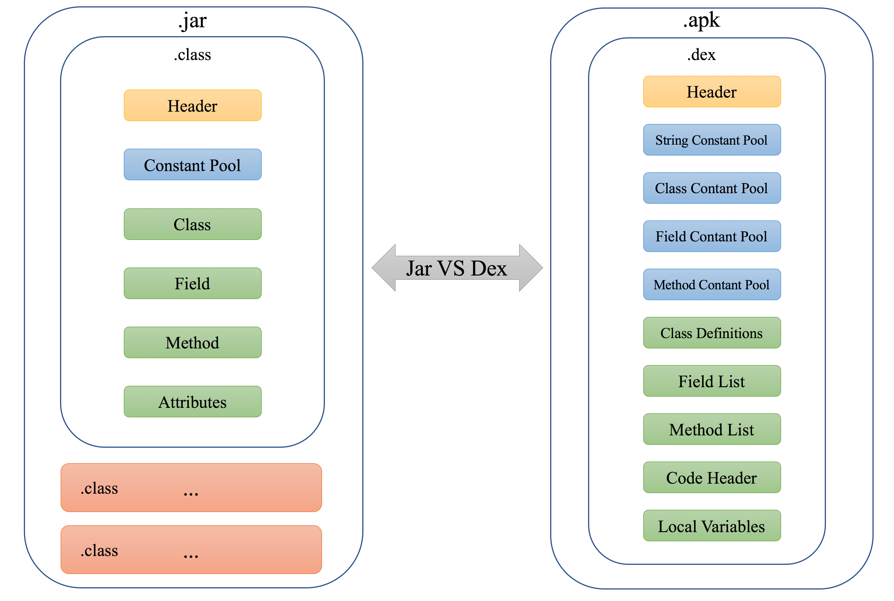 jar文件以class为区域进行划分,在连续的class区域中会包含每个class中的常量,方法,字段等等。而dex文件按照类型(例如:常量,字段,方法)划分,将同一类型的元素集中到一起进行存放。这样可以更大程度上避免重复,减少文件大小。