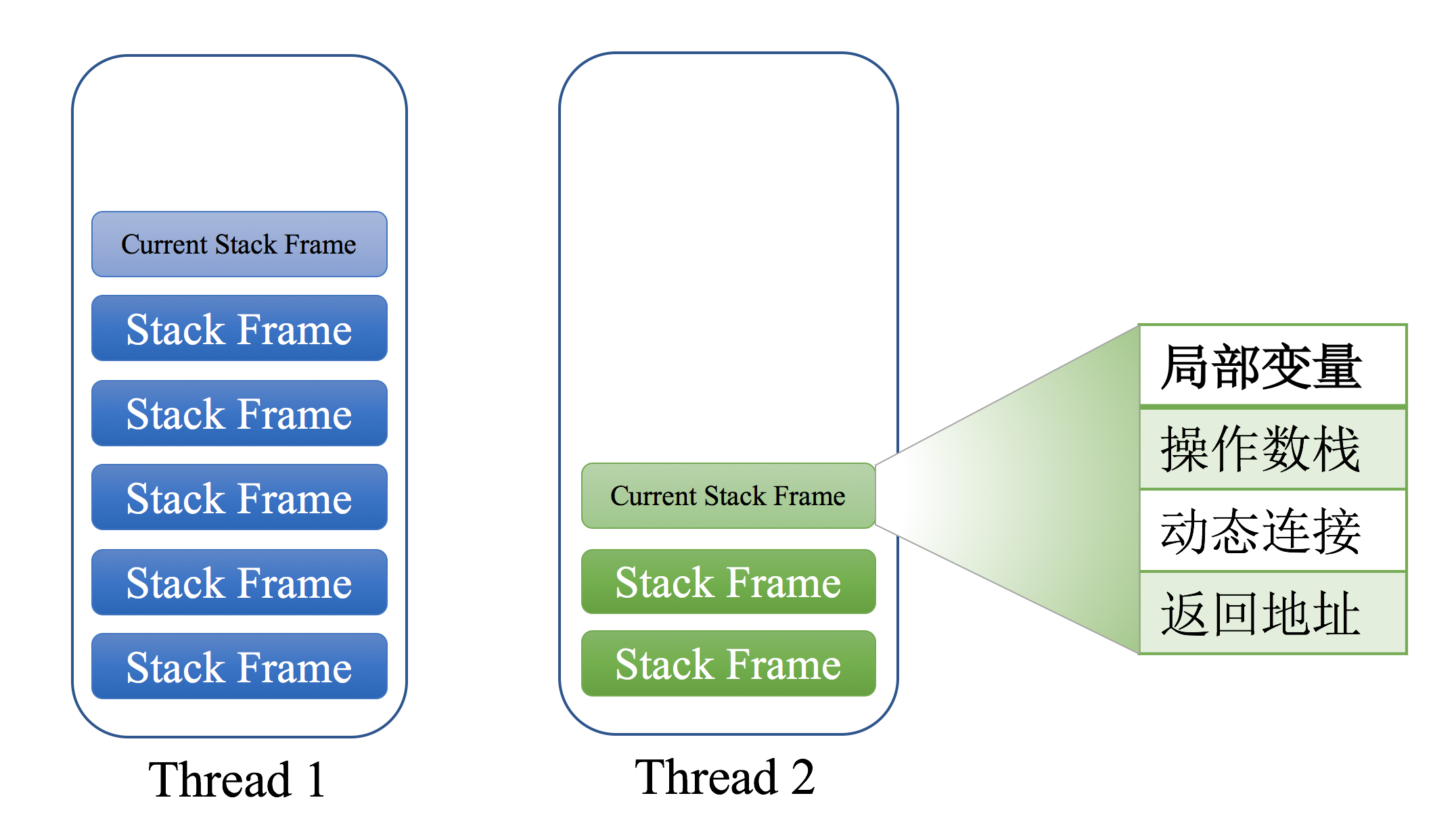 对于基于栈的虚拟机来说,每一个运行时的线程,都有一个独立的栈。栈中记录了方法调用的历史,每有一次方法调用,栈中便会多一个栈桢。最顶部的栈桢称作当前栈桢,其代表着当前执行的方法。栈桢中通常包含四个信息: