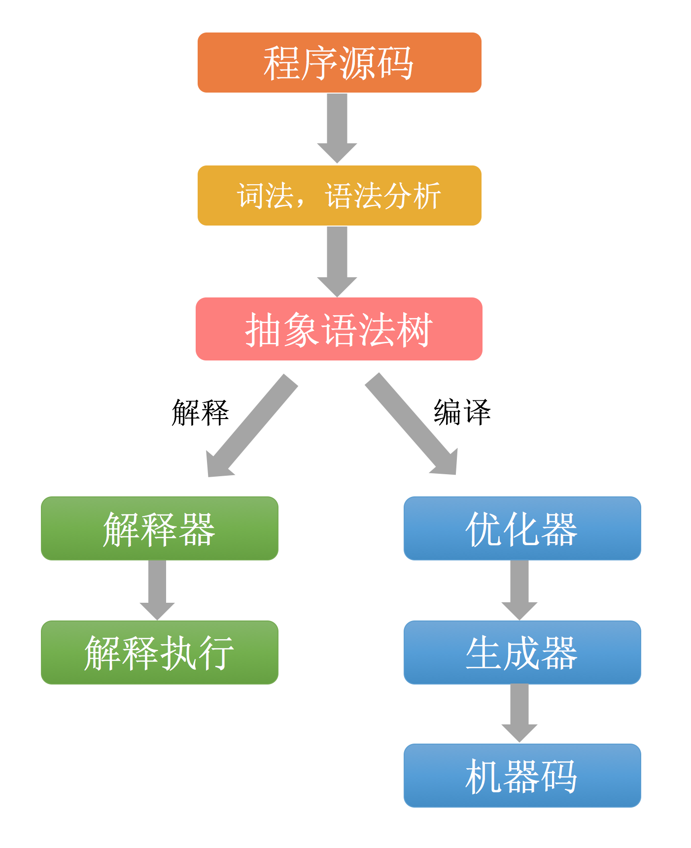 程序员通过源码的形式编写程序,而机器只能认识机器码。从编写完的程序到在机器上运行,中间必须经过一个转换的过程。这个转换的过程由两种做法,那就是:解释和编译。