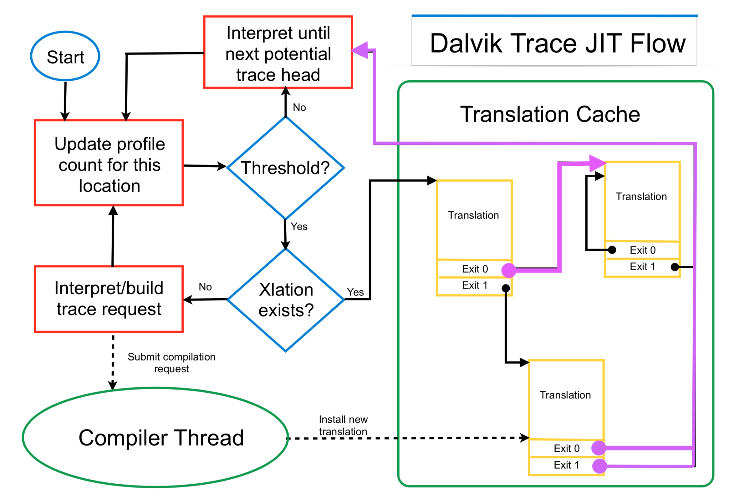 第一种是以Java方法为单位进行编译。第二种是以代码行为单位进行编译。考虑到移动设备上内存较小(编译的过程需要消耗内存),因此Dalvik上的JIT以后一种做法为主。