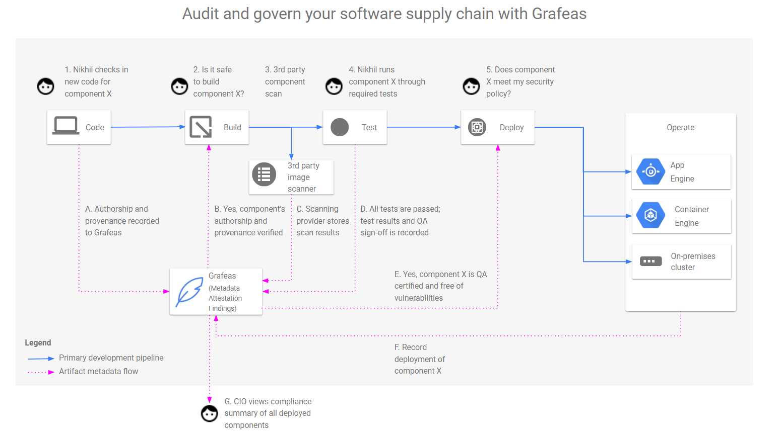 2017 年 10 月,Google 联合 JFrog、IBM 等公司推出了 Grafeas。Grafeas(希腊语中的"scribe")旨在定义统一的方式来审核和管理现代软件供应链,提供云原生制品的元数据管理能力。可以使用 Grafeas API 来存储,查询和检索有关各种软件组件的综合元数据,包括合规和风险状态。