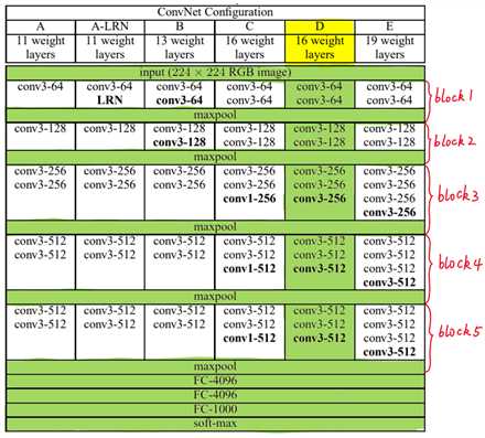 上图中,每一列对应一种结构配置。例如,图中绿色部分即指明了VGG16所采用的结构。