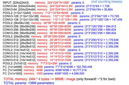 FeiFei Li在CS231的课件中给出了整个网络的全部参数的计算过程(不考虑偏置),如下图所示: