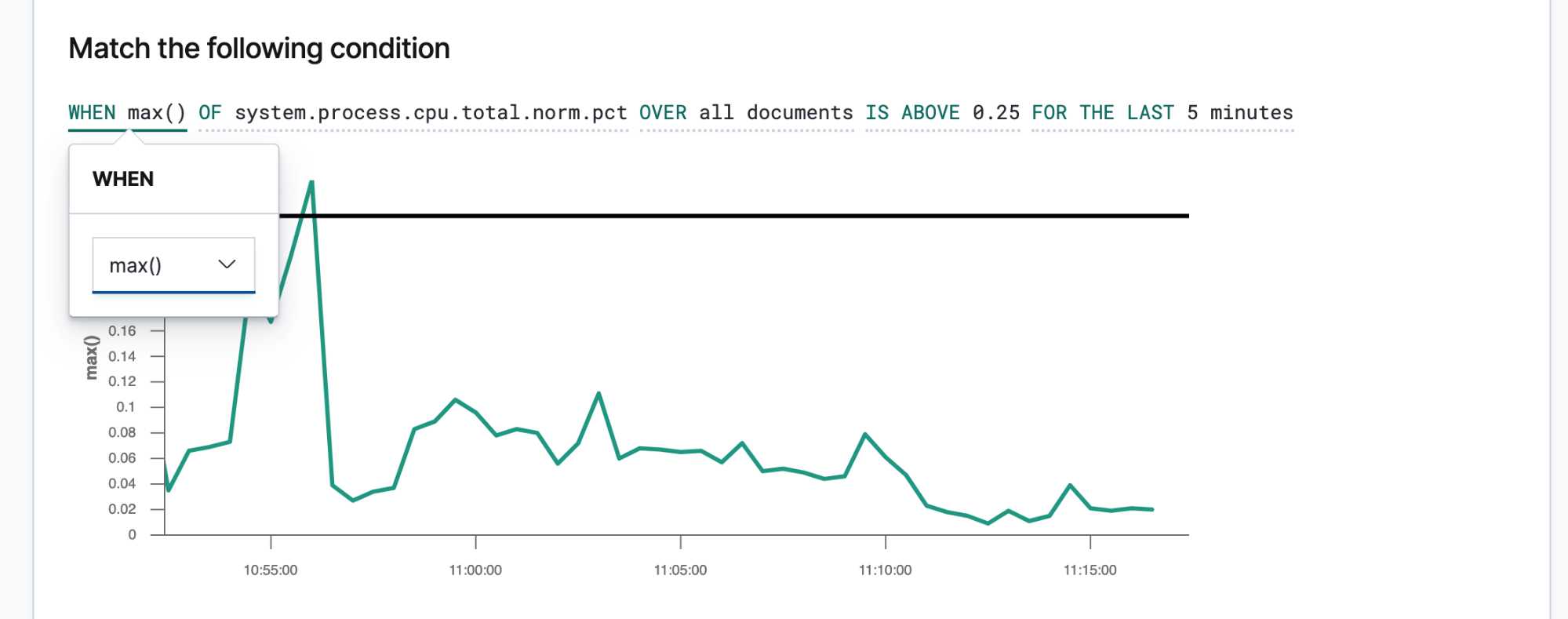 WHEN条件选择max(),监控项选择system.process.cpu.total.norm.pct,监控值选择 IS ABOVE 填写0.25