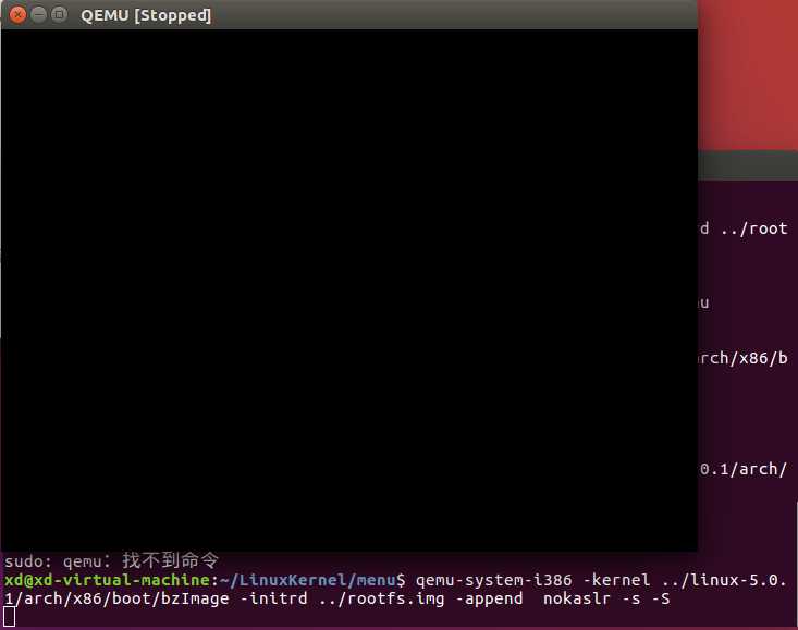 qemu-system-i386 -kernel ../linux-5.0.1/arch/x86/boot/bzImage -initrd ../rootfs.img -append nokaslr -s -S