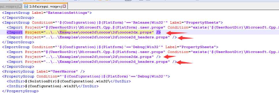 无法读取项目文件,此时用编辑器打开libfairygui.vcxproj.删除下面箭头所指向