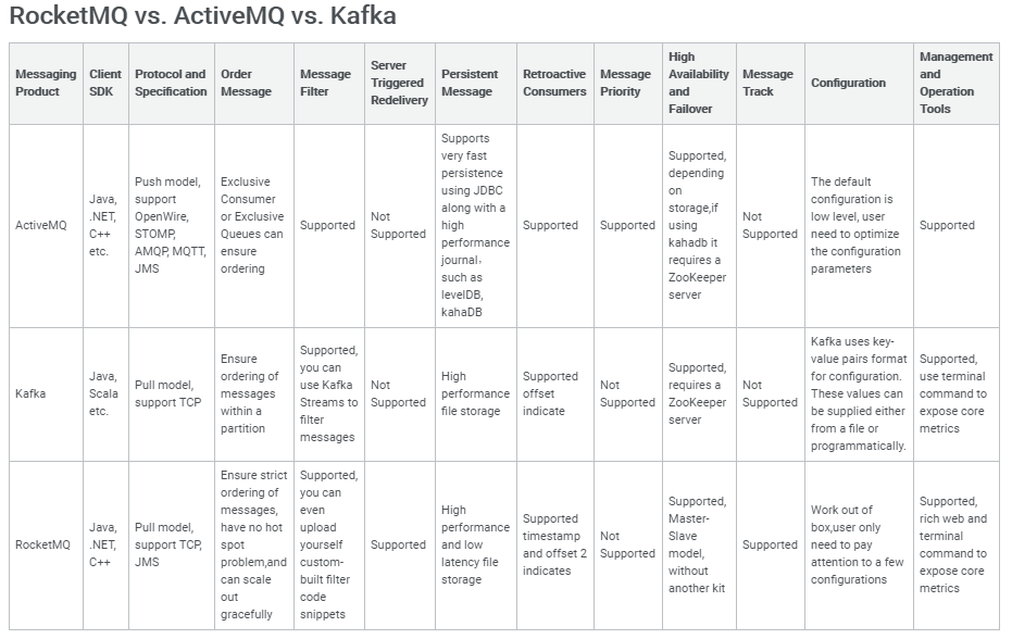 接下来我们来看看RabbitMQ、ActiveMQ、Kafka和RocketMQ之间的一些对比,从设计思路上来看,RabbitMQ是AMQP规范的参考实现,AMQP是一个线路层协议,面面俱到,很系统,也稍显复杂。目前RabbitMQ已经成为OpenStack Iaas平台首选的消息服务,其背后的支持力度不言而喻。
