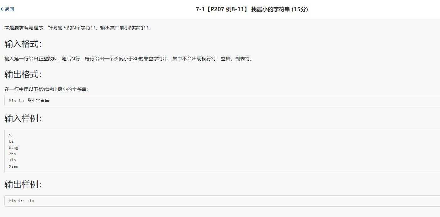 在寻找最小字符串的时候需要用到的函数有strcmp和strcpy,首先先输入输入字符串,先假设第一个字符串为最小的字符串min,再然比较接下来的字符串,当接下来的字符串比min小时,将min等于这个字符串。最后结束循环后输出min.