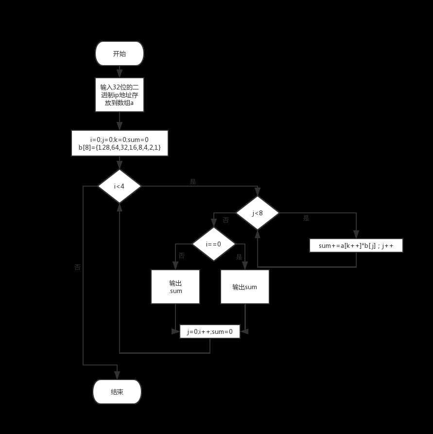 解这题我们首先需要把二进制的IP地址先存入一维数组,然后再每8个求和,计算出这个的值。注意的一点是第一个十进制整数输出时是没有“.”的,这个要做判断来分别输出。