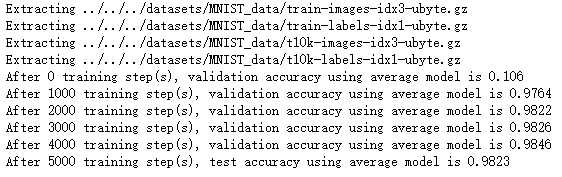 import tensorflow as tf from tensorflow.examples.tutorials.mnist import input_data INPUT_NODE = 784 # 输入节点 OUTPUT_NODE = 10 # 输出节点 LAYER1_NODE = 500 # 隐藏层数 BATCH_SIZE = 100 # 每次batch打包的样本个数 # 模型相关的参数 LEARNING_RATE_BASE = 0.8 LEARNING_RATE_DECAY = 0.99 REGULARAZTION_RATE = 0.0001 TRAINING_STEPS = 5000 MOVING_AVERAGE_DECAY = 0.99 def inference(input_tensor, avg_class, weights1, biases1, weights2, biases2): # 不使用滑动平均类 if avg_class == None: layer1 = tf.nn.relu(tf.matmul(input_tensor, weights1) + biases1) return tf.matmul(layer1, weights2) + biases2 else: # 使用滑动平均类 layer1 = tf.nn.relu(tf.matmul(input_tensor, avg_class.average(weights1)) + avg_class.average(biases1)) return tf.matmul(layer1, avg_class.average(weights2)) + avg_class.average(biases2) def train(mnist): x = tf.placeholder(tf.float32, [None, INPUT_NODE], name=‘x-input‘) y_ = tf.placeholder(tf.float32, [None, OUTPUT_NODE], name=‘y-input‘) # 生成隐藏层的参数。 weights1 = tf.Variable(tf.truncated_normal([INPUT_NODE, LAYER1_NODE], stddev=0.1)) biases1 = tf.Variable(tf.constant(0.1, shape=[LAYER1_NODE])) # 生成输出层的参数。 weights2 = tf.Variable(tf.truncated_normal([LAYER1_NODE, OUTPUT_NODE], stddev=0.1)) biases2 = tf.Variable(tf.constant(0.1, shape=[OUTPUT_NODE])) # 计算不含滑动平均类的前向传播结果 y = inference(x, None, weights1, biases1, weights2, biases2) # 定义训练轮数及相关的滑动平均类 global_step = tf.Variable(0, trainable=False) variable_averages = tf.train.ExponentialMovingAverage(MOVING_AVERAGE_DECAY, global_step) variables_averages_op = variable_averages.apply(tf.trainable_variables()) average_y = inference(x, variable_averages, weights1, biases1, weights2, biases2) # 计算交叉熵及其平均值 cross_entropy = tf.nn.sparse_softmax_cross_entropy_with_logits(logits=y, labels=tf.argmax(y_, 1)) cross_entropy_mean = tf.reduce_mean(cross_entropy) # 损失函数的计算 regularizer = tf.contrib.layers.l2_regularizer(REGULARAZTION_RATE) regularaztion = regularizer(weights1) + regularizer(weights2) loss = cross_entropy_mean + regularaztion # 设置指数衰减的学习率。 learning_rate = tf.train.exponential_decay( LEARNING_RATE_BASE, global_step, mnist.train.num_examples / BATCH_SIZE, LEARNING_RATE_DECAY, staircase=True) # 优化损失函数 train_step = tf.train.GradientDescentOptimizer(learning_rate).minimize(loss, global_step=global_step) # 反向传播更新参数和更新每一个参数的滑动平均值 with tf.control_dependencies([train_step, variables_averages_op]): train_op = tf.no_op(name=‘train‘) # 计算正确率 correct_prediction = tf.equal(tf.argmax(average_y, 1), tf.argmax(y_, 1)) accuracy = tf.reduce_mean(tf.cast(correct_prediction, tf.float32)) # 初始化会话,并开始训练过程。 with tf.Session() as sess: tf.global_variables_initializer().run() validate_feed = {x: mnist.validation.images, y_: mnist.validation.labels} test_feed = {x: mnist.test.images, y_: mnist.test.labels} # 循环的训练神经网络。 for i in range(TRAINING_STEPS): if i % 1000 == 0: validate_acc = sess.run(accuracy, feed_dict=validate_feed) print("After %d training step(s), validation accuracy using average model is %g " % (i, validate_acc)) xs,ys=mnist.train.next_batch(BATCH_SIZE) sess.run(train_op,feed_dict={x:xs,y_:ys}) test_acc=sess.run(accuracy,feed_dict=test_feed) print(("After %d training step(s), test accuracy using average model is %g" %(TRAINING_STEPS, test_acc))) def main(argv=None): mnist = input_data.read_data_sets("../../../datasets/MNIST_data", one_hot=True) train(mnist) if __name__==‘__main__‘: main()
