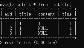 mysql> insert into article values (1,1,1,1) ; Query OK, 1 row affected (0.02 sec) mysql> insert into article values (2,1,null,1); Query OK, 1 row affected (0.00 sec) mysql> insert into article values (3,1,null,1); Query OK, 1 row affected (0.01 sec)