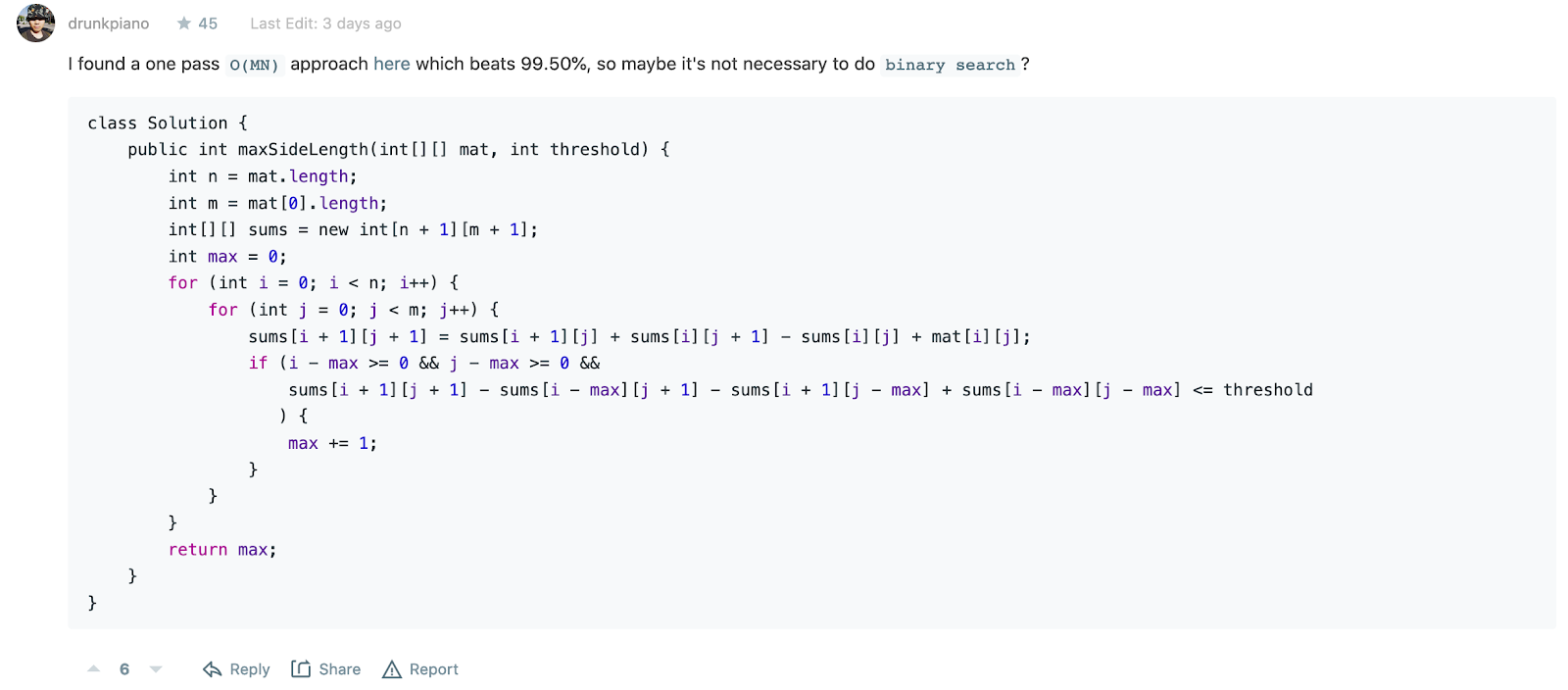 1 public int maxSideLength(int[][] mat, int threshold) { 2 if (mat == null || mat.length == 0 || mat[0].length == 0) { 3 return 0; 4 } 5 int row = mat.length; 6 int col = mat[0].length; 7 // easier to implement with the initial value on the boarder to be 0 8 int[][] prefixSum = new int[row + 1][col + 1]; 9 10 // the idea of using a prefix sum matrix should be a common technique, each cell contains the sum of 11 // its top left sum, including itself 12 for (int i = 1; i <= row; i++) { 13 for (int j = 1; j <= col; j++) { 14 prefixSum[i][j] = prefixSum[i - 1][j] + prefixSum[i][j - 1] - prefixSum[i - 1][j - 1] + mat[i - 1][j - 1]; // needs to plus itself as well 15 } 16 } 17 18 // brute force way to start from max length O(M*N*min(M, N))= O(N^3) 19 // could use binary search to find the first element 20 // https://leetcode.com/problems/maximum-side-length-of-a-square-with-sum-less-than-or-equal-to-threshold/discuss/451871/Java-sum%2Bbinary-O(m*n*log(min(mn)))-or-sum%2Bsliding-window-O(m*n) 21 for (int len = Math.min(row, col); len >= 1; len--) { 22 for (int i = 1; i + len <= row; i++) { 23 for (int j = 1; j + len <= col; j++) { 24 if (prefixSum[i + len][j + len] - prefixSum[i - 1][j + len] - prefixSum[i + len][j - 1] + prefixSum[i - 1][j - 1] <= threshold) { 25 return len + 1; 26 } 27 } 28 } 29 } 30 31 return 0; 32 }