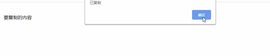 1 <template> 2 <div> 3 <el-row style="height:40px" type="flex"> 4 <el-col :span="6"> 5 <p>{{res}}</p></el-col> 6 <el-col :span="2"> 7 <el-button type="button" @click="copy()">复制</el-button> 8 </el-col> 9 10 </el-row> 11 </div> 12 </template> 13 <script> 14 export default { 15 data() { 16 return { 17 res: ‘要复制的内容‘, 18 } 19 }, 20 21 methods: { 22 copy() { 23 this.$copyText(this.res).then(function (e) { 24 alert(‘已复制‘) 25 26 }, function (e) { 27 alert(‘复制失败‘) 28 }) 29 }, 30 31 32 } 33 } 34 </script>