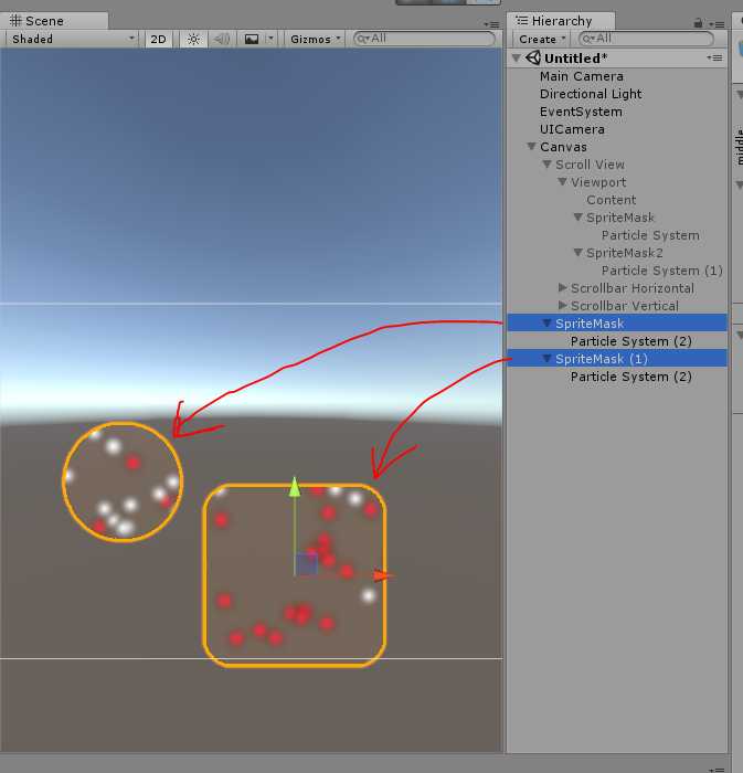 同一个层级的两个 Mask, 两个粒子发射器发射不同颜色的球, 结果粒子能在另一个 Sprite Mask 中显示出来...