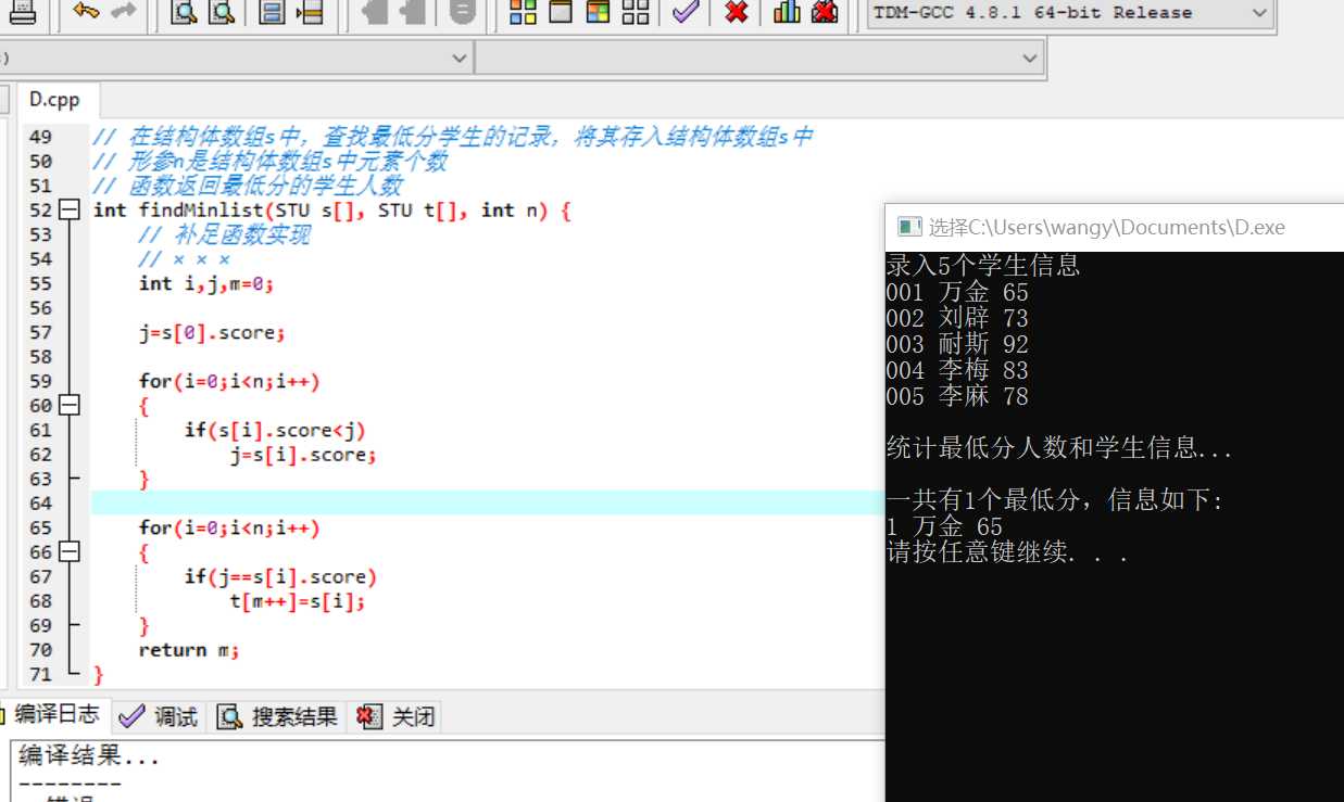 #include <stdio.h> #include <stdlib.h> const int N=5; // 定义结构体类型struct student,并定义STU为其别名 typedef struct student { long no; char name[20]; int score; }STU; // 函数声明 void input(STU s[], int n); int findMinlist(STU s[], STU t[], int n); void output(STU s[], int n); int main() { STU stu[N], minlist[N]; int count; printf("录入%d个学生信息\n", N); input(stu, N); printf("\n统计最低分人数和学生信息...\n"); count = findMinlist(stu, minlist, N); printf("\n一共有%d个最低分,信息如下:\n", count); output(minlist, count); system("pause"); return 0; } // 输入n个学生信息,存放在结构体数组s中 void input(STU s[], int n) { int i; for(i=0; i<n; i++) scanf("%ld %s %d", &s[i].no, s[i].name, &s[i].score); } // 输出结构体s中n个元素信息 void output(STU s[], int n) { int i; for(i=0; i<n; i++) printf("%ld %s %d\n", s[i].no, s[i].name, s[i].score); } // 在结构体数组s中,查找最低分学生的记录,将其存入结构体数组s中 // 形参n是结构体数组s中元素个数 // 函数返回最低分的学生人数 int findMinlist(STU s[], STU t[], int n) { // 补足函数实现 // ××× int i,j,m=0; j=s[0].score; for(i=0;i<n;i++) { if(s[i].score<j) j=s[i].score; } for(i=0;i<n;i++) { if(j==s[i].score) t[m++]=s[i]; } return m; }