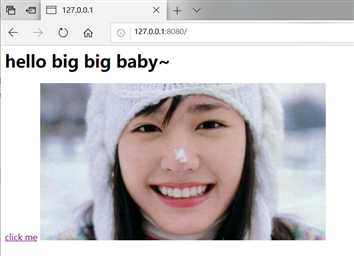 <h1>hello big big baby~</h1> <a href="https://www.mzitu.com">click me</a> <img src="https://ss2.bdstatic.com/70cFvnSh_Q1YnxGkpoWK1HF6hhy/it/u=276938278,2845396192&fm=26&gp=0.jpg"/>