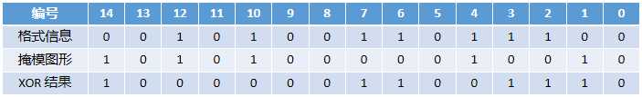 由于格式信息的正确译码对整个符号的译至关重要,它会在 QR 码中绘制两次以提供冗余。格式信息的最低位模块编号为 0,最高位编号为 14。为避免混淆,下表标示了之前生成格式信息与掩模图形以及两者进行 XOR 运算之后的结果的各个位编号。