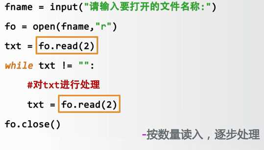 文件句柄.read(2) #一次读入文件的前两个字节,只要读入的不为空就继续读入,属于分批处理。