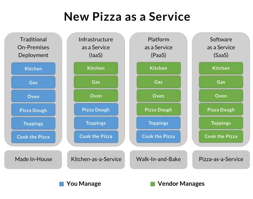 你可以从头到尾,自己生产披萨,但是这样比较麻烦,需要准备的东西多,因此你决定外包一部分工作,采用他人的服务。你有三个方案。