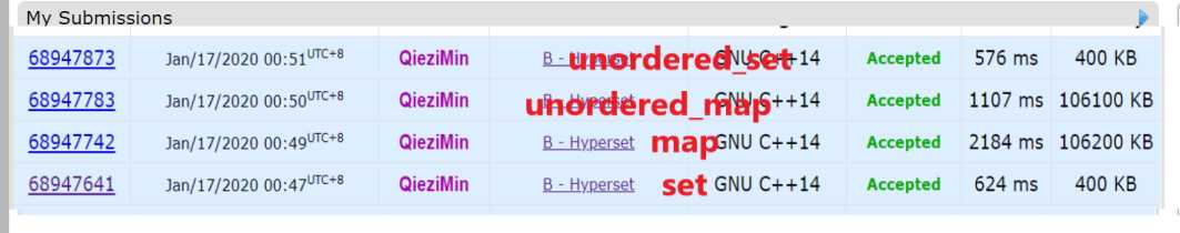 | 68947742 | Jan/17/2020 00:49UTC+8 | QieziMin | B - Hyperset | GNU C++14 | Accepted | 2184 ms | 106200 KB |