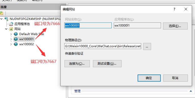 (2)记录下发布路径,并在IIS中新增两个站点,指向该路径,并设置不同的端口号