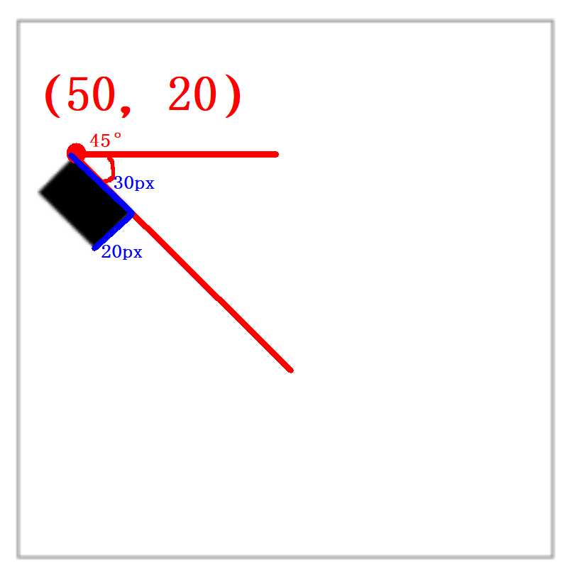 1 <canvas id="canvas" width="200" height="200" style="border:solid 1px #999;"></canvas> 2 <script> 3 draw(); 4 function draw(){ 5 //使用document.getElementById() 方法, 根据 canvas 元素的 id 获取对 canvas 的引用 6 var canvas = document.getElementById(‘canvas‘); 7 //通过 canvas 元素的 getContext() 方法获取画布上下文(context),创建 context 对象,以获取允许进行绘制的 2D 环境 8 if(canvas.getContext){ 9 var ctx = canvas.getContext(‘2d‘); 10 ctx.rotate(Math.PI*45/180); 11 ctx.fillRect(50,20,30,20); 12 } 13 } 14 </script>