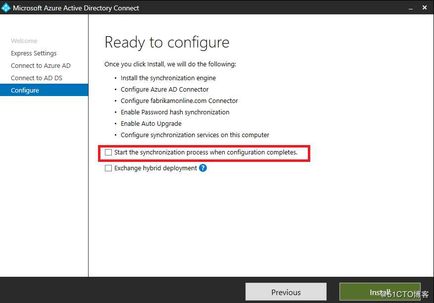 3.如果你是single-forest domain并且使用Password hash synchronize作为身份验证,那么可以使用默认的Express settings进行安装和部署Azure AD Connect