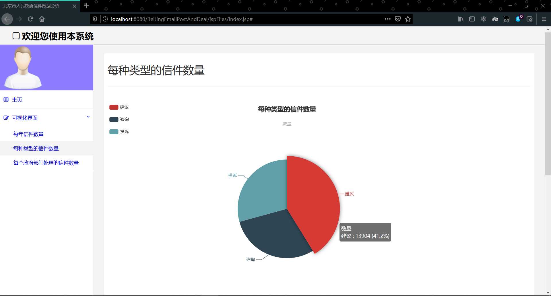 1 function makePageToPart2() 2 { 3 var Area = ‘‘; 4 Area += ‘<div class="row">‘; 5 Area += ‘<div class="col-md-12">‘; 6 Area += ‘<h2>每种类型的信件数量</h2>‘; 7 Area += ‘</div>‘; 8 Area += ‘</div>‘; 9 Area += ‘<hr />‘; 10 Area += ‘<br>‘; 11 Area += ‘<div id="MessageArea">‘; 12 Area += ‘ <div id="displayArea" style="width:1000px;height:500px;"></div>‘; 13 Area += ‘</div>‘; 14 document.getElementById("page-inner").innerHTML = Area; 15 loadPart2(); 16 } 17 function loadPart2() 18 { 19 var xmlHttp = null; 20 try{ 21 xmlHttp = new XMLHttpRequest(); 22 } catch (e1) { 23 try { 24 xmlHttp = new ActiveXObject("Microsoft.XMLHTTP"); 25 } catch (e2) { 26 alert("Your browser does not support XMLHTTP!"); 27 return; 28 } 29 } 30 xmlHttp.onreadystatechange = function() { 31 if (xmlHttp.readyState == 4) { 32 if (xmlHttp.status == 200) 33 { 34 s = xmlHttp.responseText; 35 var InformationSet = eval(‘(‘+s+‘)‘); 36 var myChart = echarts.init(document.getElementById(‘displayArea‘)); 37 var option = { 38 title: { 39 text: ‘每种类型的信件数量‘, 40 subtext: ‘数量‘, 41 left: ‘center‘ 42 }, 43 tooltip: { 44 trigger: ‘item‘, 45 formatter: ‘数量 <br/>{b} : {c} ({d}%)‘ 46 }, 47 legend: { 48 orient: ‘vertical‘, 49 left: ‘left‘, 50 data: InformationSet.KIND 51 }, 52 series: [ 53 { 54 name: ‘访问来源‘, 55 type: ‘pie‘, 56 radius: ‘55%‘, 57 center: [‘50%‘, ‘60%‘], 58 data: InformationSet.DATA, 59 emphasis: { 60 itemStyle: { 61 shadowBlur: 10, 62 shadowOffsetX: 0, 63 shadowColor: ‘rgba(0, 0, 0, 0.5)‘ 64 } 65 } 66 } 67 ] 68 }; 69 // 使用刚指定的配置项和数据显示图表。 70 myChart.setOption(option); 71 } 72 } 73 }; 74 var url ="../com/servlet/ServletForKindData"; 75 76 xmlHttp.open("POST", url, true); 77 xmlHttp.setRequestHeader("Content-Type","application/x-www-form-urlencoded"); 78 xmlHttp.send(null); 79 }