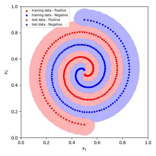 1 # 局部加权之逻辑回归 2 3 import numpy 4 from matplotlib import pyplot as plt 5 6 7 def spiral_point(val, center=(0.5, 0.5)): 8 rn = 0.4 * (105 - val) / 104 9 an = numpy.pi * (val - 1) / 25 10 11 x0 = center[0] + rn * numpy.sin(an) 12 y0 = center[1] + rn * numpy.cos(an) 13 z0 = 0 14 x1 = center[0] - rn * numpy.sin(an) 15 y1 = center[1] - rn * numpy.cos(an) 16 z1 = 1 17 18 return (x0, y0, z0), (x1, y1, z1) 19 20 21 def spiral_data(valList): 22 dataList = list(spiral_point(val) for val in valList) 23 data0 = numpy.array(list(item[0] for item in dataList)) 24 data1 = numpy.array(list(item[1] for item in dataList)) 25 return data0, data1 26 27 28 # 生成训练数据集 29 trainingValList = numpy.arange(1, 101, 1) 30 trainingData0, trainingData1 = spiral_data(trainingValList) 31 trainingSet = numpy.vstack((trainingData0, trainingData1)) 32 33 # 生成测试数据集 34 testValList = numpy.arange(1.5, 101.5, 1) 35 testData0, testData1 = spiral_data(testValList) 36 testSet = numpy.vstack((testData0, testData1)) 37 38 39 # 假设模型 40 def h_theta(x, theta): 41 val = 1. / (1. + numpy.exp(-numpy.sum(x * theta))) 42 return val 43 44 45 # 假设模型预测正确之概率 46 def p_right(x, y_, theta): 47 val = h_theta(x, theta) ** y_ * (1. - h_theta(x, theta)) ** (1 - y_) 48 return val 49 50 51 # 加权损失函数 52 def JW(X, Y_, W, theta): 53 JVal = 0 54 for colIdx in range(X.shape[1]): 55 x = X[:, colIdx:colIdx+1] 56 y_ = Y_[colIdx, 0] 57 w = W[colIdx, 0] 58 pVal = p_right(x, y_, theta) if p_right(x, y_, theta) >= 1.e-100 else 1.e-100 59 JVal += w * numpy.log(pVal) 60 JVal = -JVal / X.shape[1] 61 return JVal 62 63 64 # 加权损失函数之梯度 65 def JW_grad(X, Y_, W, theta): 66 grad = numpy.zeros(shape=theta.shape) 67 for colIdx in range(X.shape[1]): 68 x = X[:, colIdx:colIdx+1] 69 y_ = Y_[colIdx, 0] 70 w = W[colIdx, 0] 71 grad += w * (y_ - h_theta(x, theta)) * x 72 grad = -grad / X.shape[1] 73 return grad 74 75 76 # 加权损失函数之Hessian 77 def JW_Hess(X, Y_, W, theta): 78 Hess = numpy.zeros(shape=(theta.shape[0], theta.shape[0])) 79 for colIdx in range(X.shape[1]): 80 x = X[:, colIdx:colIdx+1] 81 y_ = Y_[colIdx, 0] 82 w = W[colIdx, 0] 83 Hess += w * h_theta(x, theta) * (1 - h_theta(x, theta)) * numpy.matmul(x, x.T) 84 Hess = Hess / X.shape[1] 85 return Hess 86 87 88 class LWLR(object): 89 90 def __init__(self, trainingSet, tauBound=(0.001, 0.1), epsilon=1.e-3): 91 self.__trainingSet = trainingSet # 训练集 92 self.__tauBound = tauBound # tau之搜索边界 93 self.__epsilon = epsilon # tau之搜索精度 94 95 96 def search_tau(self): 97 ‘‘‘ 98 交叉验证返回最优tau 99 采用黄金分割法计算最优tau 100 ‘‘‘ 101 X, Y_ = self.__get_XY_(self.__trainingSet) 102 lowerBound, upperBound = self.__tauBound 103 lowerTau = self.__calc_lowerTau(lowerBound, upperBound) 104 upperTau = self.__calc_upperTau(lowerBound, upperBound) 105 lowerErr = self.__calc_generalErr(X, Y_, lowerTau) 106 upperErr = self.__calc_generalErr(X, Y_, upperTau) 107 108 while (upperTau - lowerTau) > self.__epsilon: 109 if lowerErr > upperErr: 110 lowerBound = lowerTau 111 lowerTau = upperTau 112 lowerErr = upperErr 113 upperTau = self.__calc_upperTau(lowerBound, upperBound) 114 upperErr = self.__calc_generalErr(X, Y_, upperTau) 115 else: 116 upperBound = upperTau 117 upperTau = lowerTau 118 upperErr = lowerErr 119 lowerTau = self.__calc_lowerTau(lowerBound, upperBound) 120 lowerErr = self.__calc_generalErr(X, Y_, lowerTau) 121 # print("{}, {}~{}, {}~{}, {}".format(lowerBound, lowerTau, lowerErr, upperTau, upperErr, upperBound)) 122 self.bestTau = (upperTau + lowerTau) / 2 123 # print(self.bestTau) 124 return self.bestTau 125 126 127 def __calc_generalErr(self, X, Y_, tau): 128 cnt = 0 129 generalErr = 0 130 131 for idx in range(X.shape[1]): 132 tmpx = X[:, idx:idx+1] 133 tmpy_ = Y_[idx, 0] 134 tmpX = numpy.hstack((X[:, 0:idx], X[:, idx+1:])) 135 tmpY_ = numpy.vstack((Y_[0:idx, :], Y_[idx+1:, :])) 136 tmpW = self.__get_W(tmpx, tmpX, tau) 137 theta, tab = self.__optimize_theta(tmpX, tmpY_, tmpW) 138 # print(idx, tab, tmpx.reshape(-1), tmpy_, h_theta(tmpx, theta), theta.reshape(-1)) 139 if not tab: 140 continue 141 cnt += 1 142 generalErr -= numpy.log(p_right(tmpx, tmpy_, theta)) 143 generalErr /= cnt 144 # print(tau, generalErr) 145 return generalErr 146 147 148 def __calc_lowerTau(self, lowerBound, upperBound): 149 delta = upperBound - lowerBound 150 lowerTau = upperBound - delta * 0.618 151 return lowerTau 152 153 154 def __calc_upperTau(self, lowerBound, upperBound): 155 delta = upperBound - lowerBound 156 upperTau = lowerBound + delta * 0.618 157 return upperTau 158 159 160 def __optimize_theta(self, X, Y_, W, maxIter=1000, epsilon=1.e-9): 161 ‘‘‘ 162 maxIter: 最大迭代次数 163 epsilon: 收敛判据 ~ 梯度趋于0则收敛 164 ‘‘‘ 165 theta = self.__init_theta((X.shape[0], 1)) 166 JVal = JW(X, Y_, W, theta) 167 grad = JW_grad(X, Y_, W, theta) 168 Hess = JW_Hess(X, Y_, W, theta) 169 for i in range(maxIter): 170 if self.__is_converged1(grad, epsilon): 171 return theta, True 172 173 dCurr = -numpy.matmul(numpy.linalg.inv(Hess + 1.e-9 * numpy.identity(Hess.shape[0])), grad) 174 alpha = self.__calc_alpha_by_ArmijoRule(theta, JVal, grad, dCurr, X, Y_, W) 175 176 thetaNew = theta + alpha * dCurr 177 JValNew = JW(X, Y_, W, thetaNew) 178 if self.__is_converged2(thetaNew - theta, JValNew - JVal, epsilon): 179 return thetaNew, True 180 181 theta = thetaNew 182 JVal = JValNew 183 grad = JW_grad(X, Y_, W, theta) 184 Hess = JW_Hess(X, Y_, W, theta) 185 # print(i, JVal, grad.reshape(-1)) 186 else: 187 if self.__is_converged(grad, epsilon): 188 return theta, True 189 190 return theta, False 191 192 193 def __calc_alpha_by_ArmijoRule(self, thetaCurr, JCurr, gCurr, dCurr, X, Y_, W, c=1.e-4, v=0.5): 194 i = 0 195 alpha = v ** i 196 thetaNext = thetaCurr + alpha * dCurr 197 JNext = JW(X, Y_, W, thetaNext) 198 while True: 199 if JNext <= JCurr + c * alpha * numpy.matmul(dCurr.T, gCu